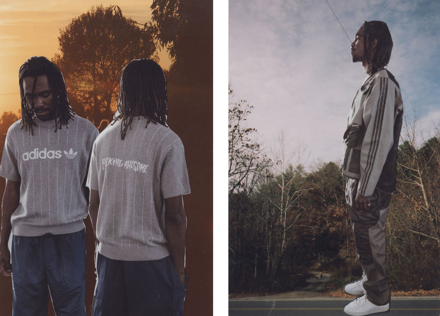La colección está compuesta por prendas cómodas y técnicas, siguiendo la tendencia actual de la moda outdoor. Destacamos la chaqueta de pesca con multibolsillos frontales junto un bucket y unos pantalones a conjunto, además del chandal adidas de los 80s rediseñado al estilo Fucking Awesome. La guinda son dos pares de zapas en blanco/marino /royal y blanco/blanco/oro llamadas Experiment 1 y Experiment 2.
